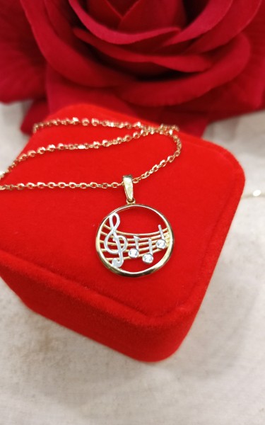 Przedmiotem sprzedaży jest okrągła zawieszka z nutkami zdobionymi cyrkoniami , wykonana z 14-karatowego (p.585) żółtego złota.