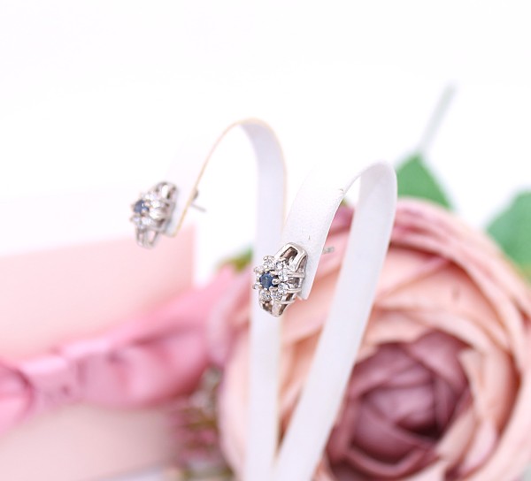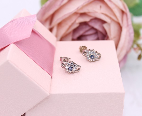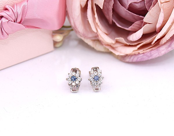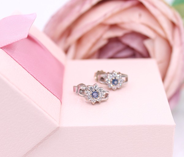 Przedmiotem sprzedaży są kolczyki, wykonane z 14-karatowego,(p.585)białego złota, ozdobione na froncie niebieskim kamieniem i cyrkoniami.