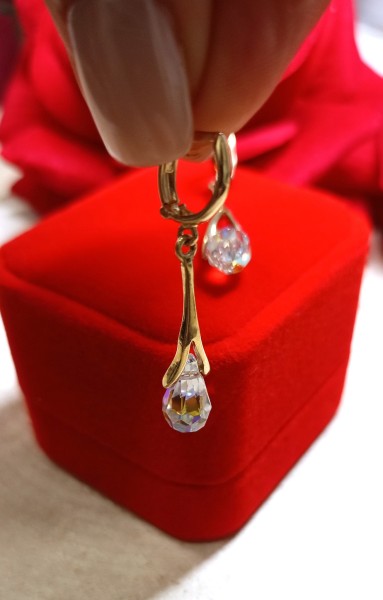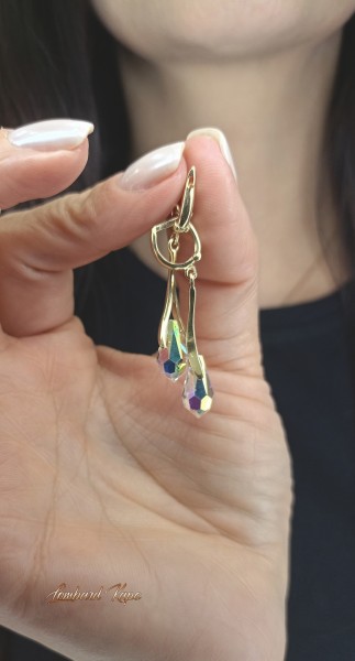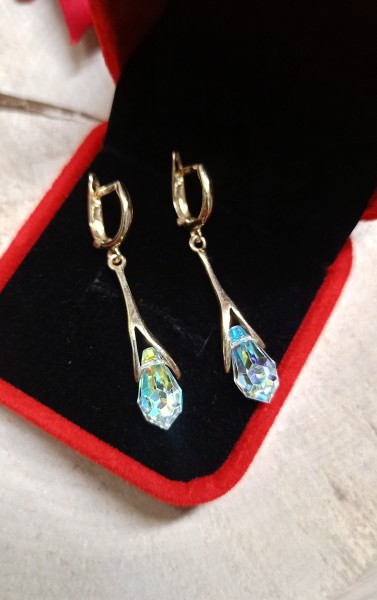 Przedmiotem sprzedaży wiszące kolczyki z pięknie mieniącą się feerią barw cyrkonią,wykonane z 14-karatowego (p.585), żółtego złota.