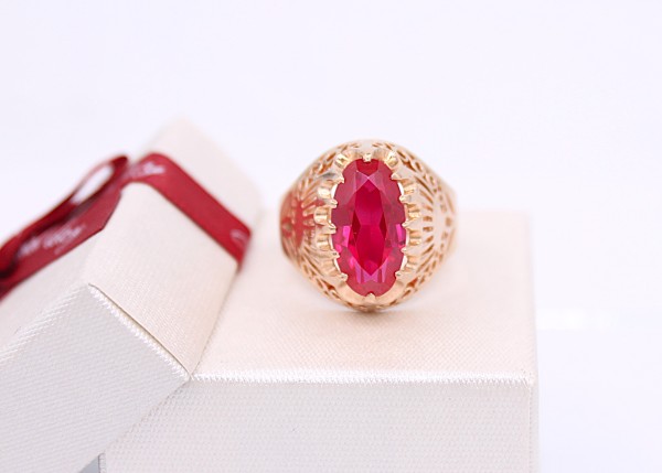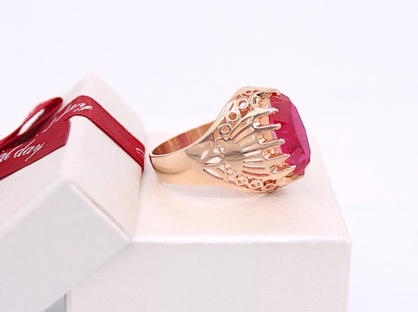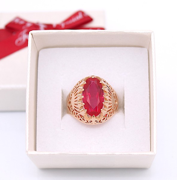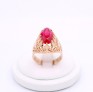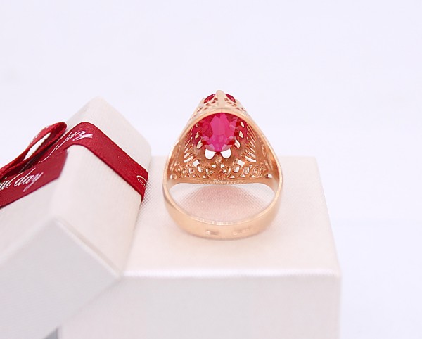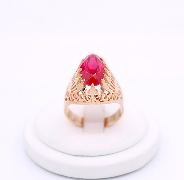 Przedmiotem sprzedaży jest pierścionek z malinowym kamieniem, wykonany z 14-karatowego (p.585),różowego złota.