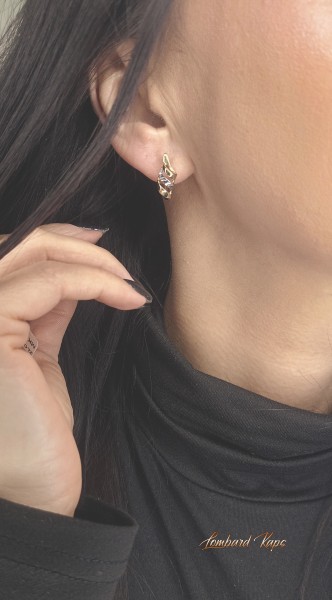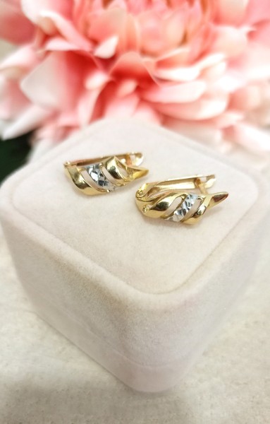 Przedmiotem sprzedaży są eleganckie kolczyki z żebrowanym frontem, wykonane z 14-karatowego (p.585), żółtego i białego złota.