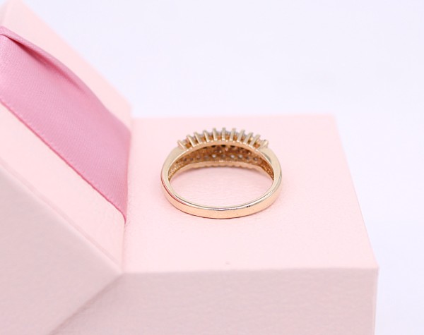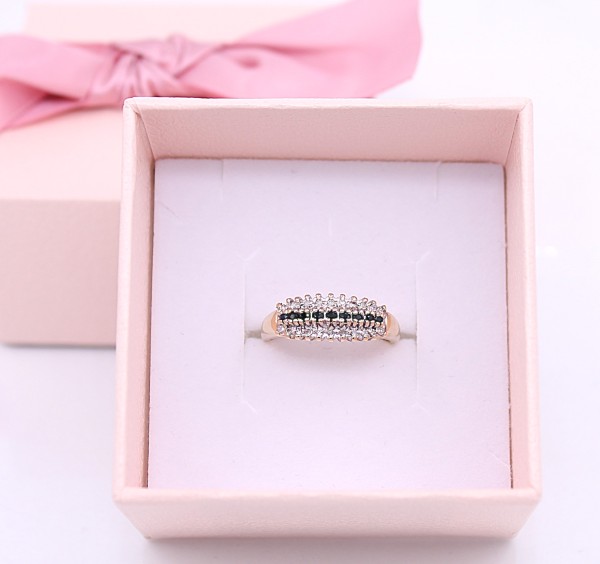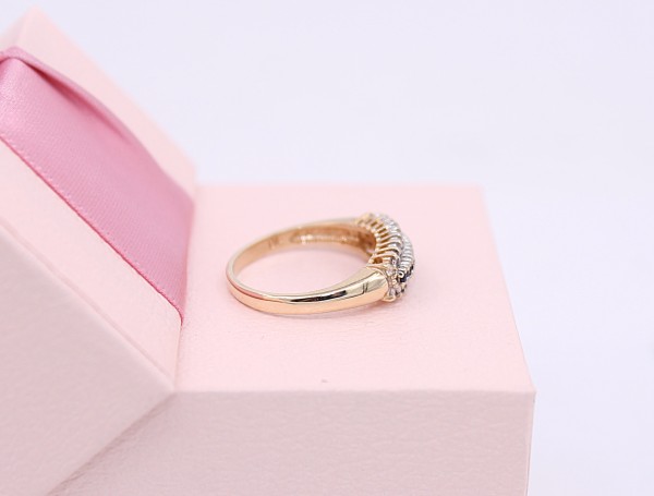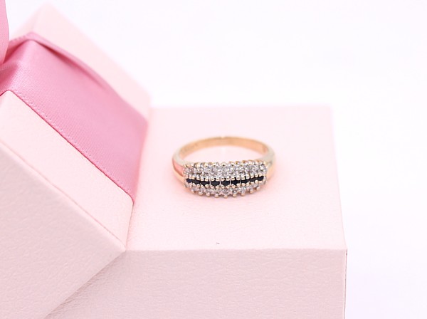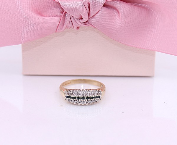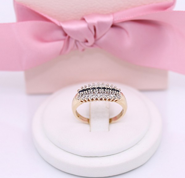 Przedmiotem sprzedaży jest pierścionek z brylancikami i granatowymi kamieniami,wykonany z 9-karatowego (p.375) żółtego złota.