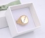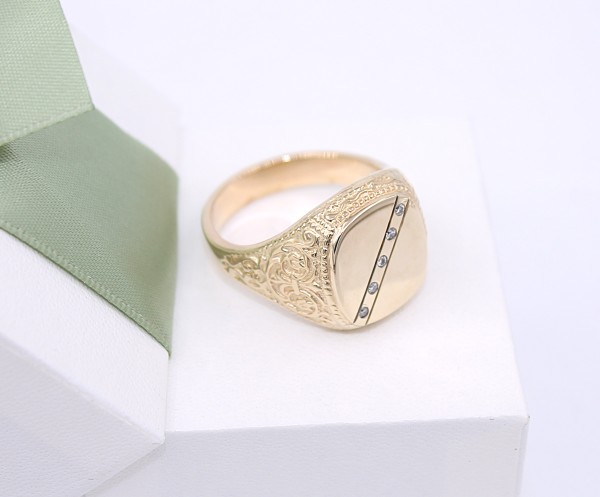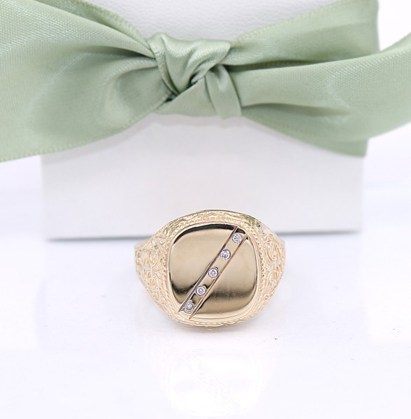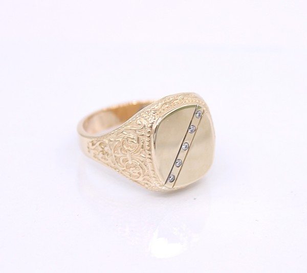Przedmiotem sprzedaży jest sygnet, wykonany z 14-karatowego(p.585),żółtego złota, ozdobiony na froncie pięcioma brylancikami.