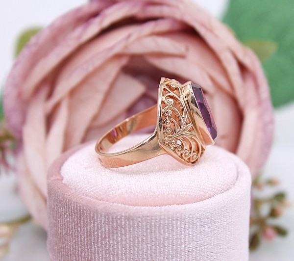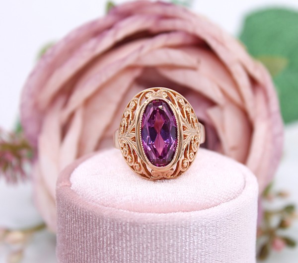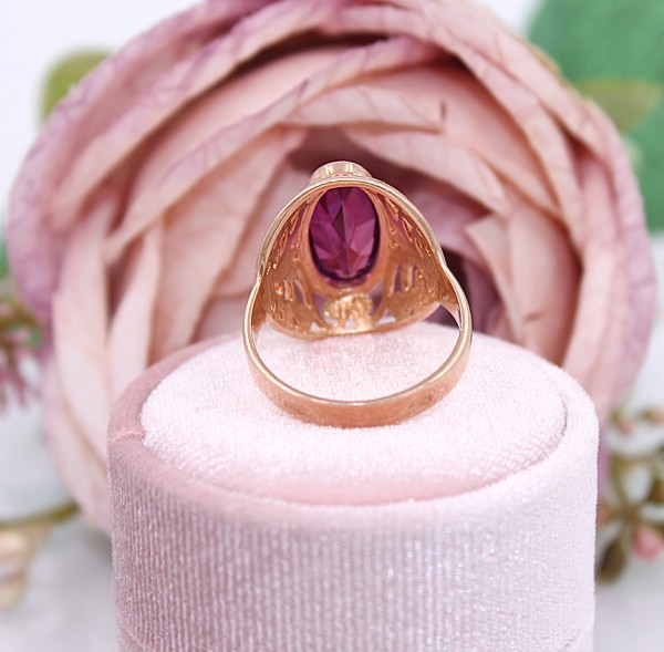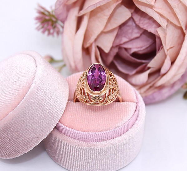 Przedmiotem sprzedaży jest pierścionek z fioletowym kamieniem, wykonany z 14-karatowego (p.585),różowego złota.