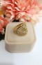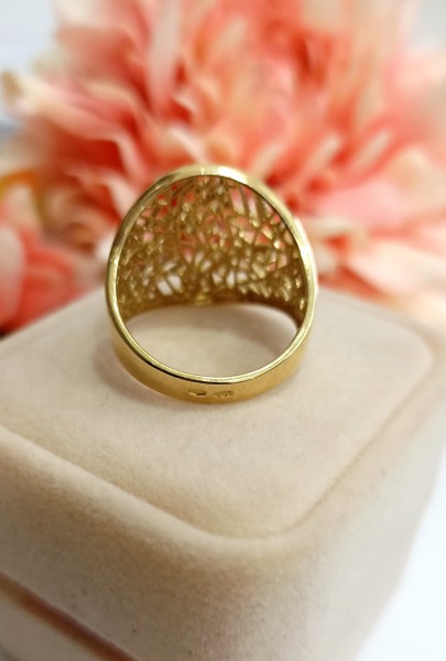 Przedmiotem sprzedaży jest pierścionek z szerokim, ażurowym frontem, zdobionym cyrkoniami, wykonany z 14-karatowego (p.585), żółtego złota.