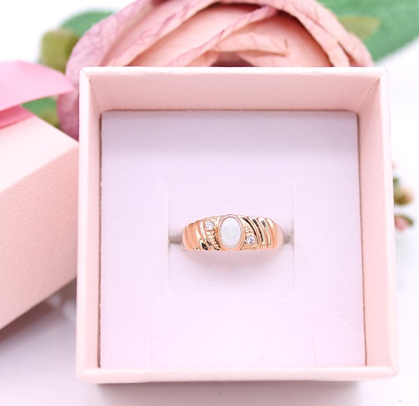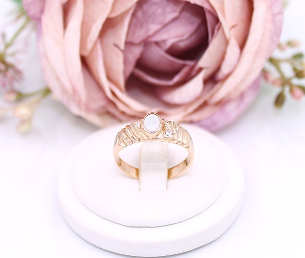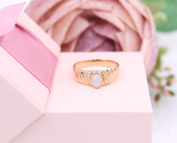 Przedmiotem sprzedaży jest pierścionek wykonany z 14-karatowego(p.585),żółtego złota, ozdobiony na froncie opalem i cyrkoniami.