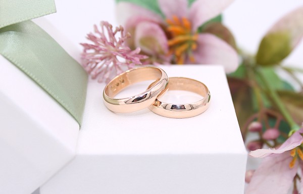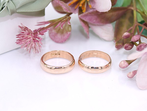 Przedmiotem sprzedaży jest komplet klasycznych obrączek ślubnych, wykonany z 14-karatowego (p.583), lekko różowego złota.