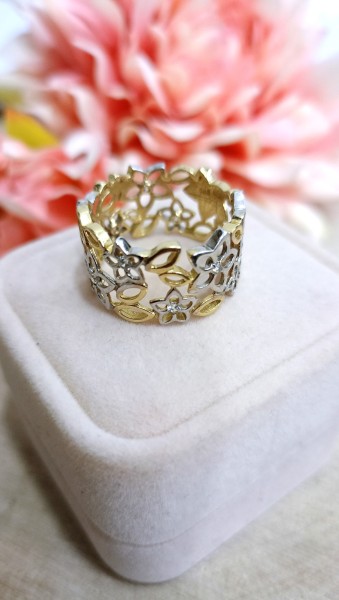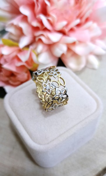 Przedmiotem sprzedaży jest pierścionek wykonany z 14-karatowego (p.585), żółtego i białego złota.