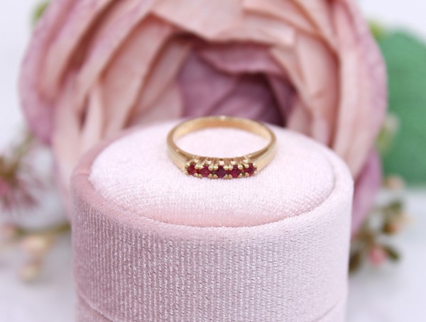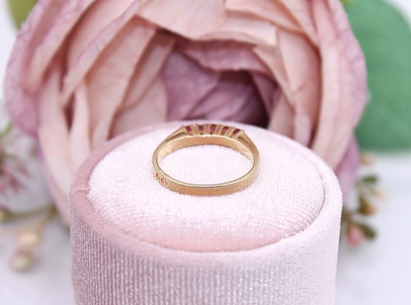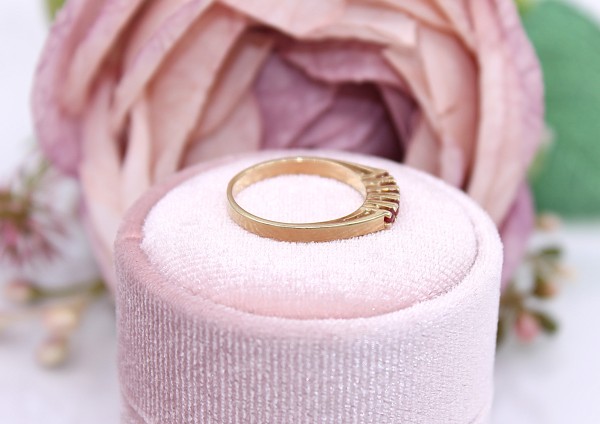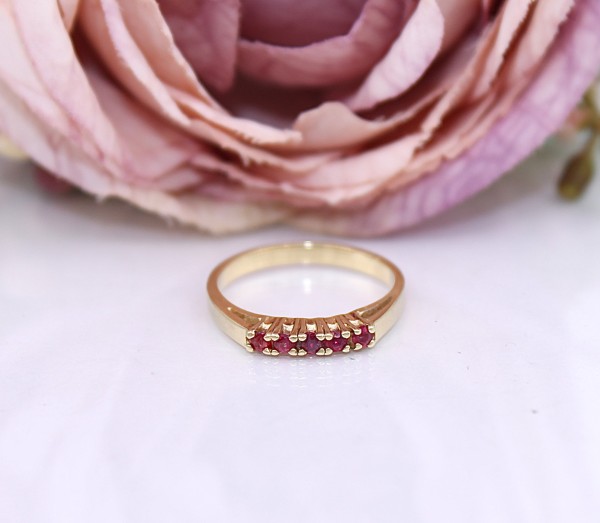 Przedmiotem sprzedaży jest pierścionek z różowymi kamieniem, wykonany z 14-karatowego (p.585),żółtego złota.
