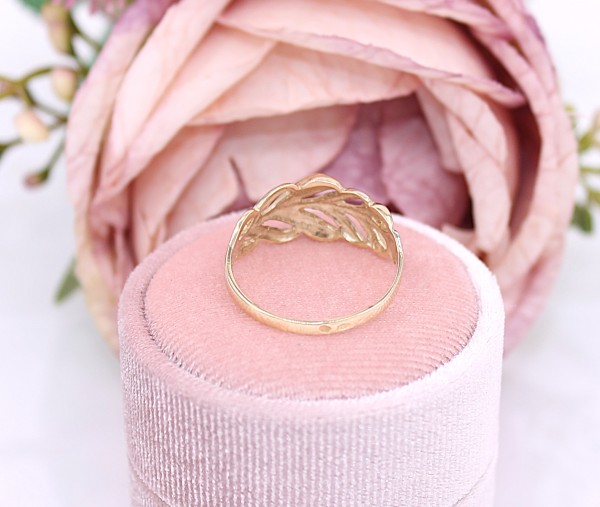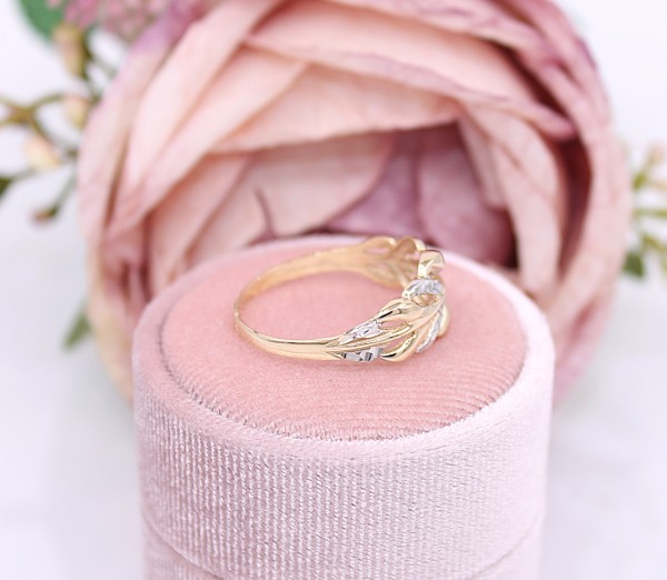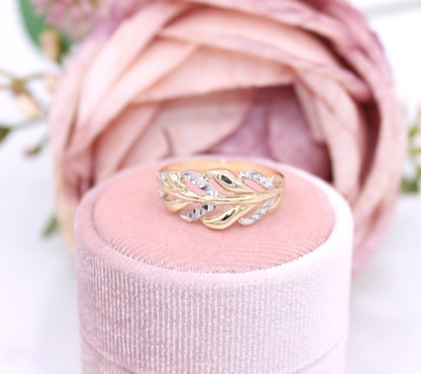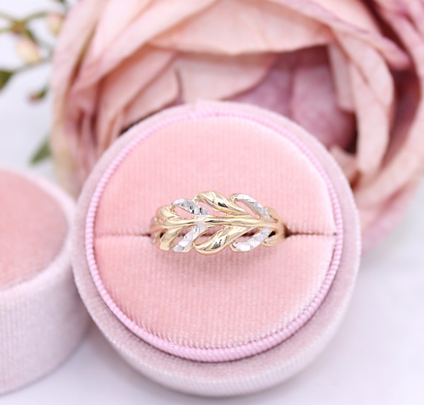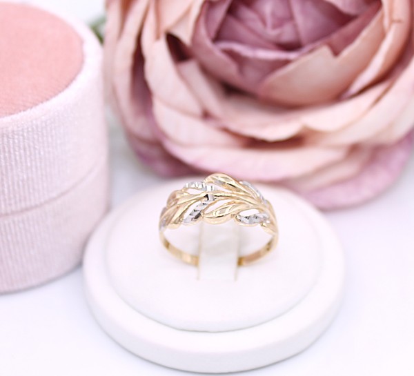 Przedmiotem sprzedaży jest pierścionek, wykonany z 14-karatowego (p.585), żółtego i białego złota - ozdobiony listkami na froncie.