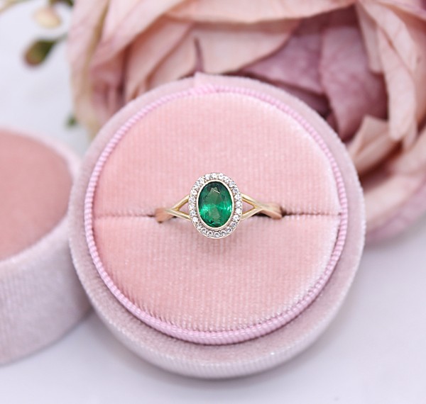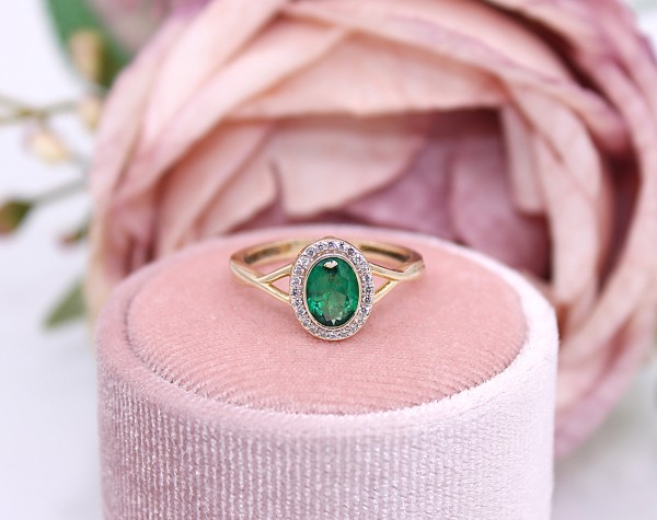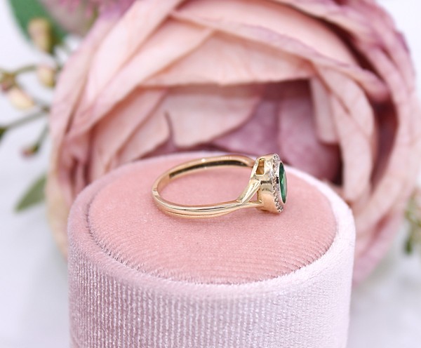 Przedmiotem sprzedaży jest pierścionek z zielonym kamieniem i cyrkoniami, wykonany z 14-karatowego (p.585),żółtego złota.
