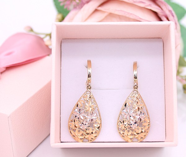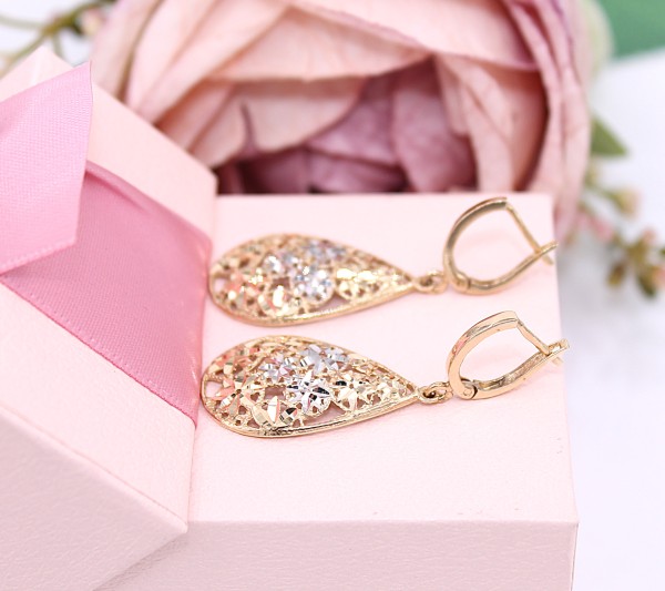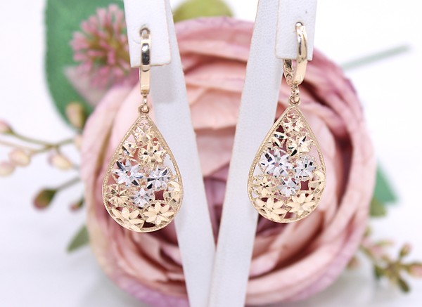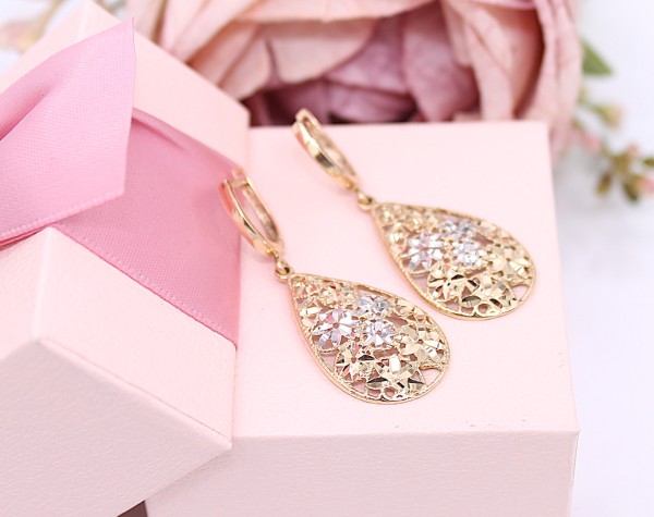Przedmiotem sprzedaży są kolczyki z ażurowym frontem - kwiatuszki,wykonane z 14-karatowego (p.585), żółtego i białego złota.