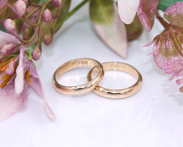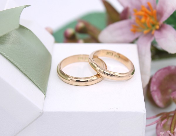 Przedmiotem sprzedaży jest komplet klasycznych obrączek ślubnych, wykonany z 14-karatowego (p.583), żółtego złota.
