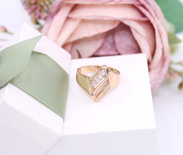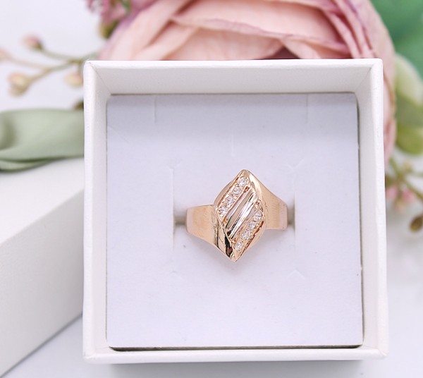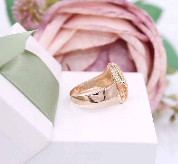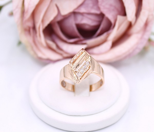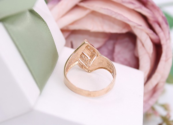 Przedmiotem sprzedaży jest pierścionek wykonany z 14-karatowego(p.585),różowego złota z cyrkoniami.