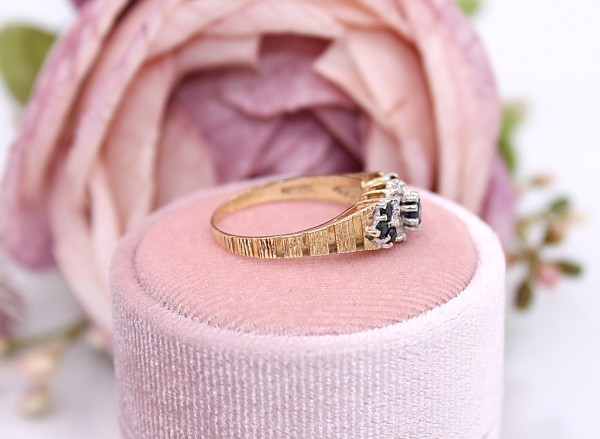 Przedmiotem sprzedaży jest pierścionek z brylantami i szafirami,wykonany z 9-karatowego (p.375) żółtego złota.