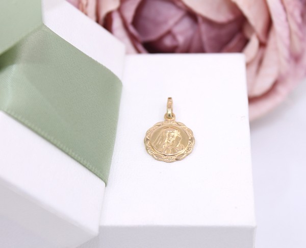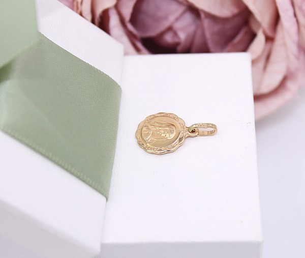 Przedmiotem sprzedaży jest zawieszka z wizerunkiem Matki Boskiej ,wykonana z 14-karatowego (p.585), żółtego złota.