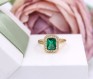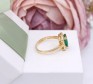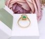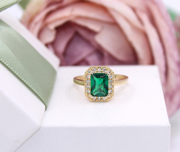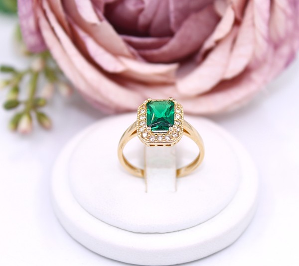 Przedmiotem sprzedaży jest pierścionek wykonany z 14-karatowego (p.585), żółtego złota z zielonym kamieniem i cyrkoniami.