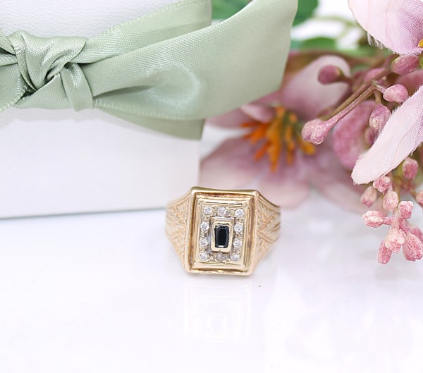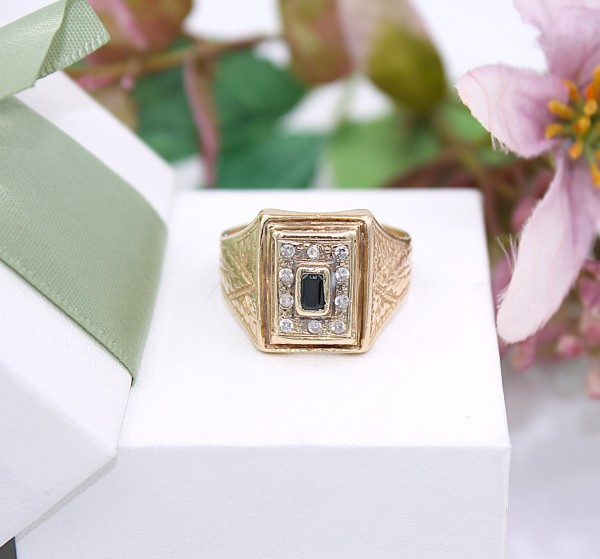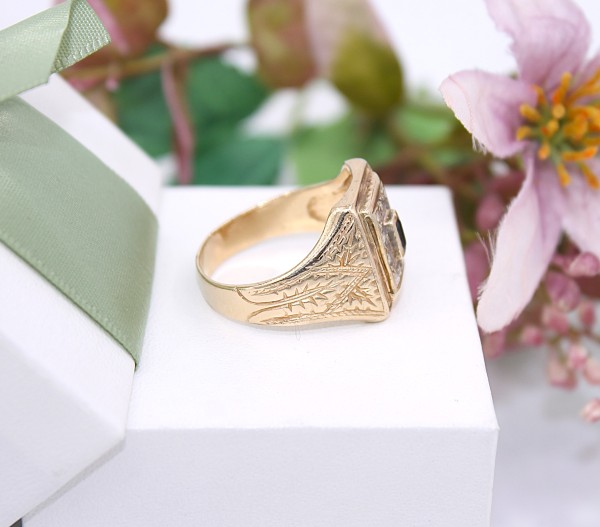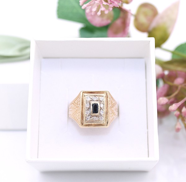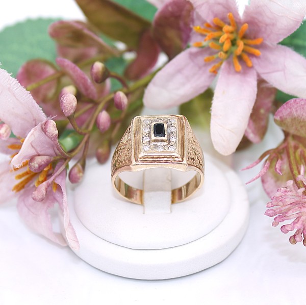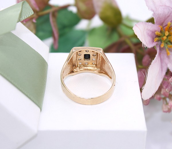 Przedmiotem sprzedaży jest sygnet, wykonany z 14-karatowego(p.585),żółtego złota, ozdobiony na froncie cyrkoniami i czarnym kamieniem.