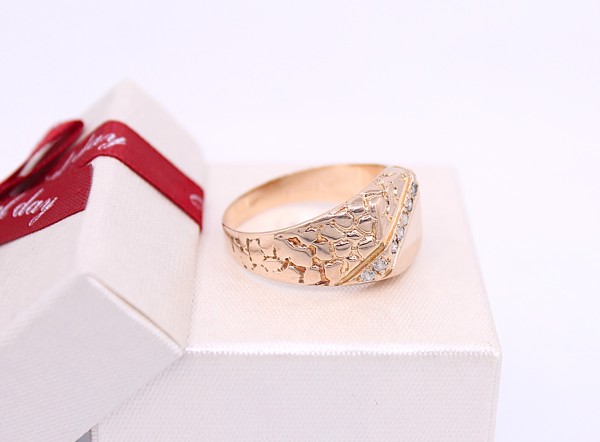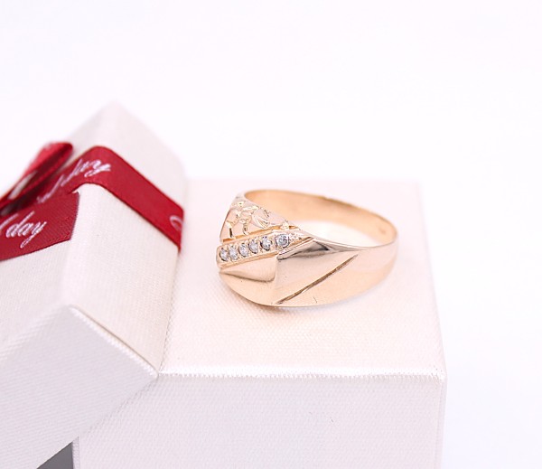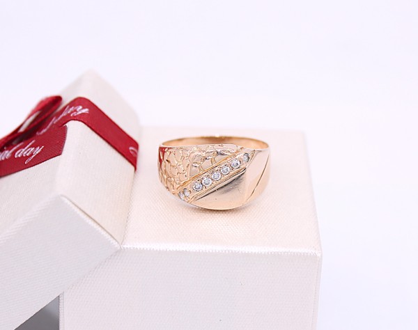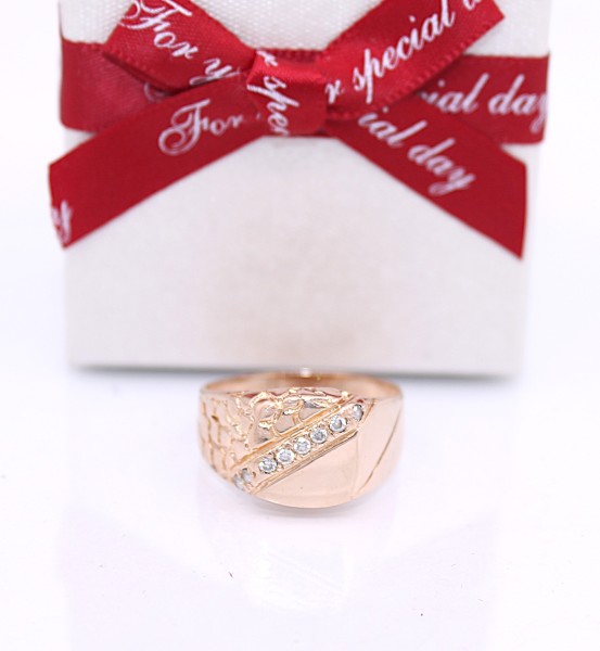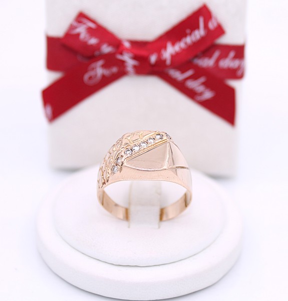 Przedmiotem sprzedaży jest sygnet, wykonany z 14-karatowego(p.585),lekko różowego złota, ozdobiony na froncie cyrkoniami.