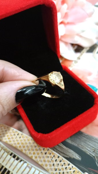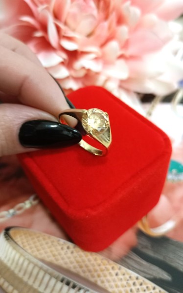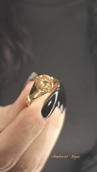 Przedmiotem sprzedaży jest pierścionek z cyrkonią w kolorze kwarcu dymnego wykonany z 14-karatowego(p.585), żółtego złota.