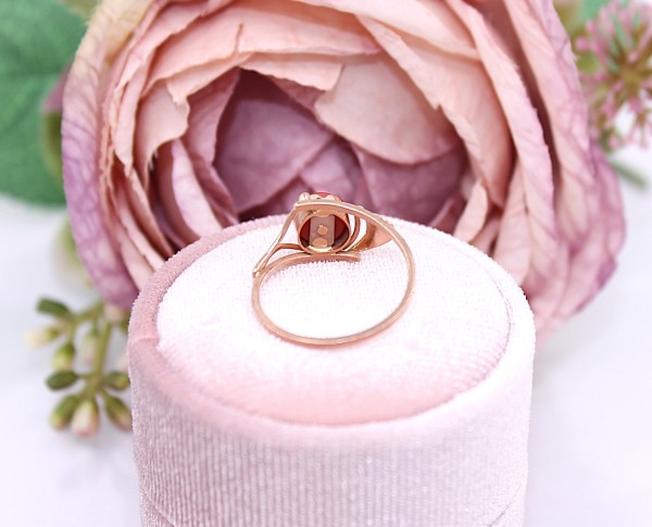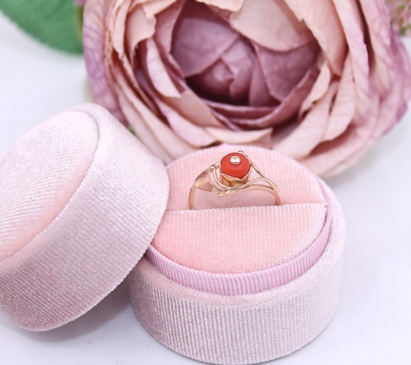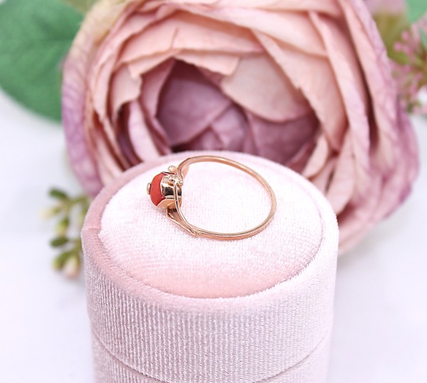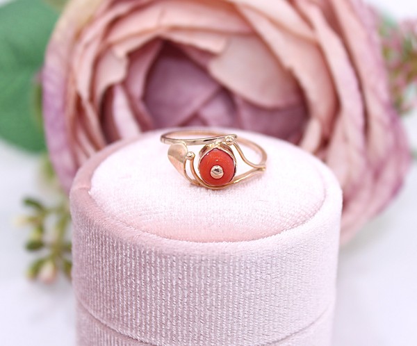 Przedmiotem sprzedaży jest pierścionek z koralem, wykonany z 14-karatowego(p.585), różowego złota.