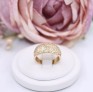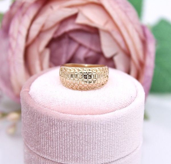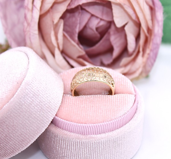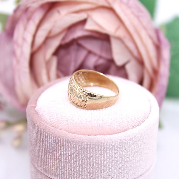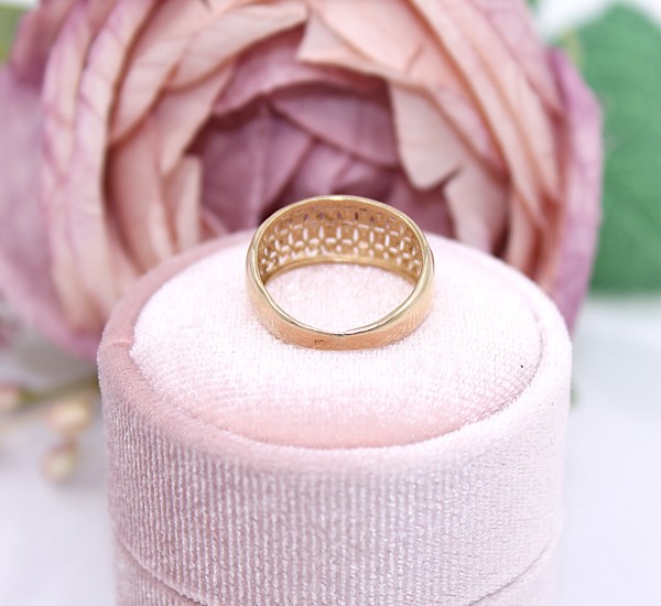 Przedmiotem sprzedaży jest pierścionek wykonany z 14-karatowego (p.585), żółtego złota z ażurowym frontem.