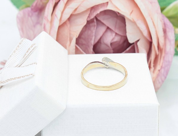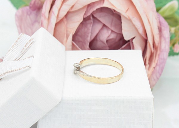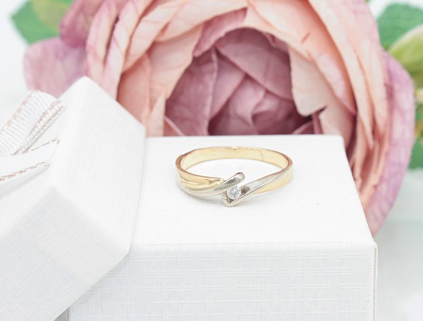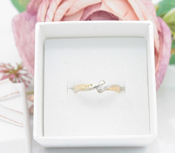 Przedmiotem sprzedaży jest pierścionek z dronym brylancikiem,wykonany z 14-karatowego (p.585) żółtego i białego złota.
