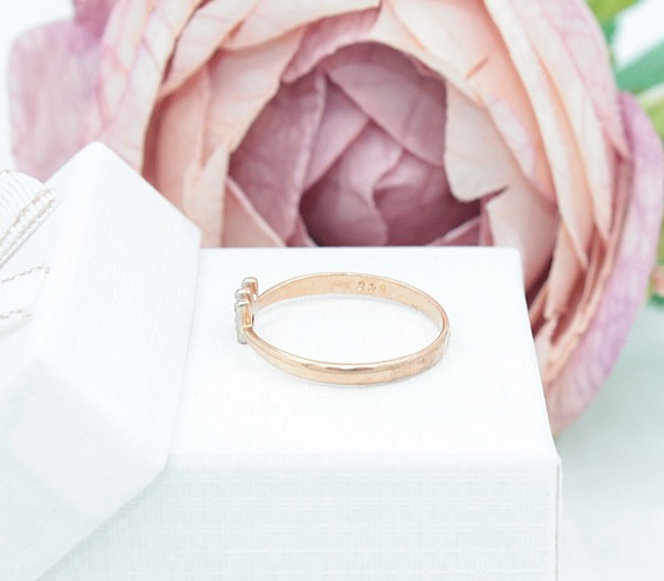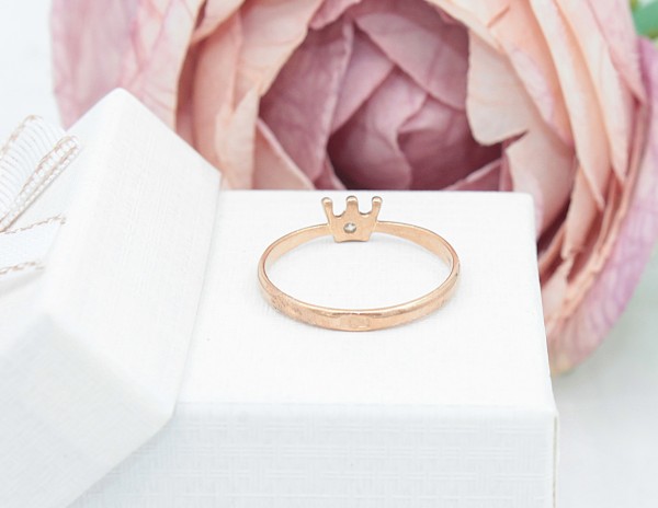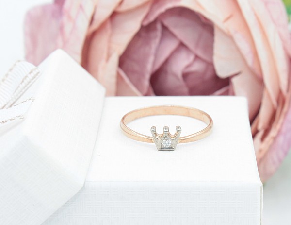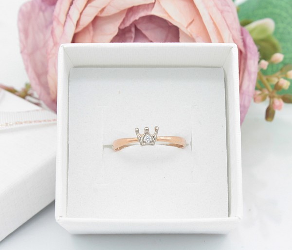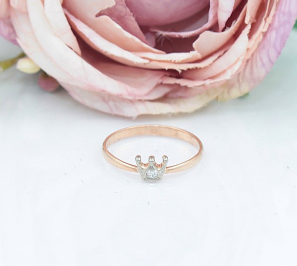 Przedmiotem sprzedaży jest pierścionek - korona z brylancikiem, wykonany z 14-karatowego (p.585) różowego i białego złota.
