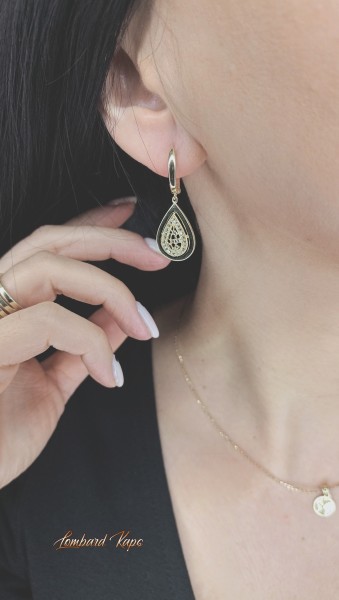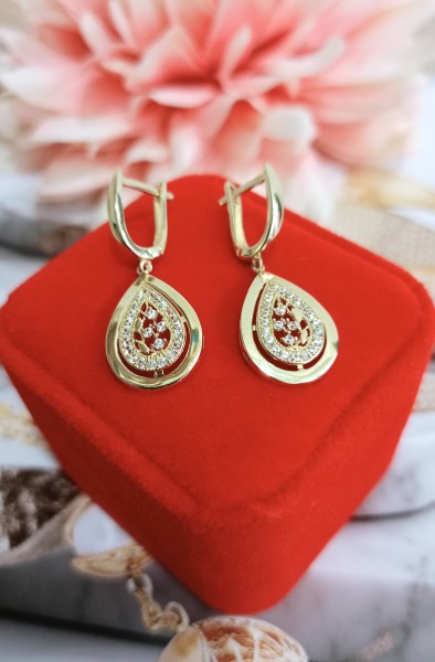 Przedmiotem sprzedaży są złote,wiszące kolczyki łezki zdobione cyrkoniami wykonane z 14-karatowego (p.585) żółtego złota.