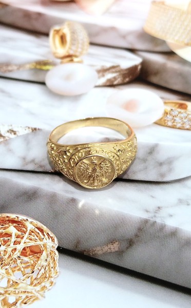 Przedmiotem sprzedaży jest męski sygnet patriotyczny wykonany z 14-karatowego(p.585),żółtego złota.