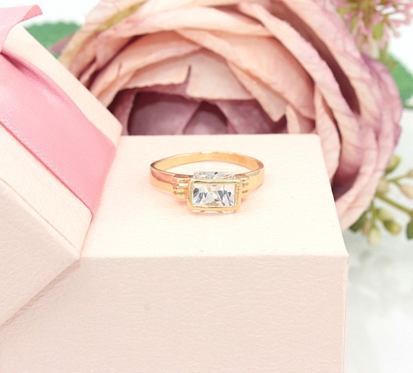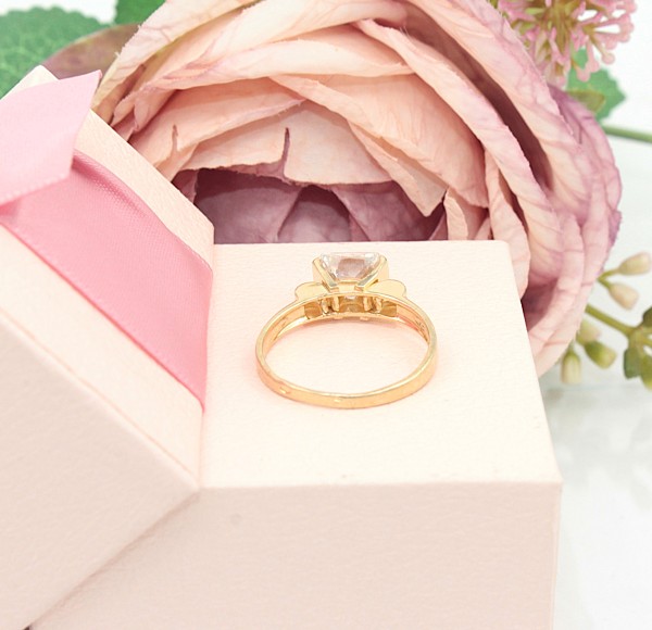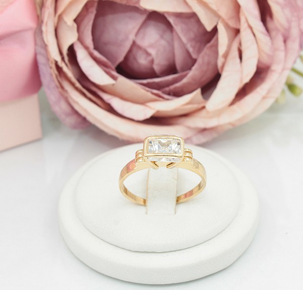 Przedmiotem sprzedaży jest pierścionek wykonany z 14-karatowego(p.585), żółtego złota, ozdobiony na froncie cyrkonią.