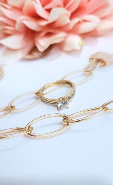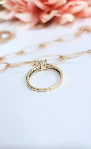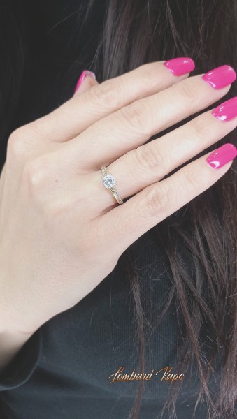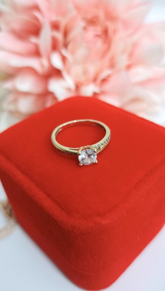 Przedmiotem sprzedaży jest pierścionek z białymi cyrkonimi, wykonany z 14-karatowego (p.585), żółtego złota.