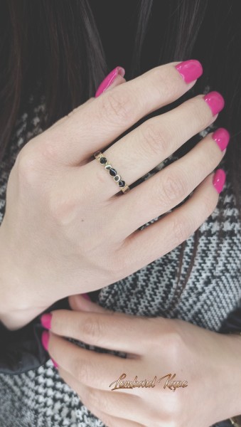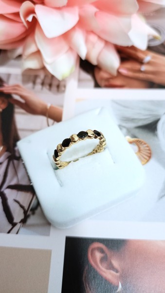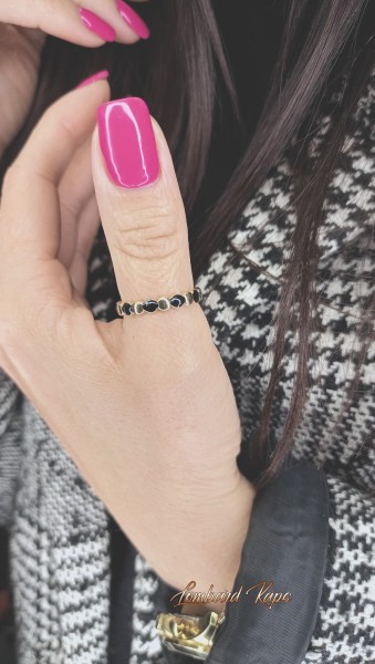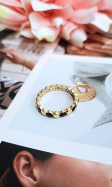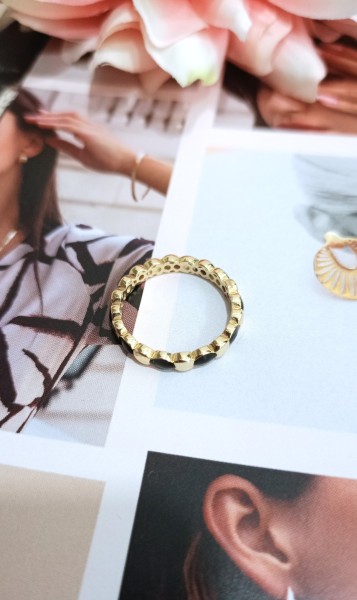 Przedmiotem sprzedaży jest pierścionek/designerska obrączka z czarną emalią jubilerską, wykonany z 14-karatowego (p.585) żółtego złota.