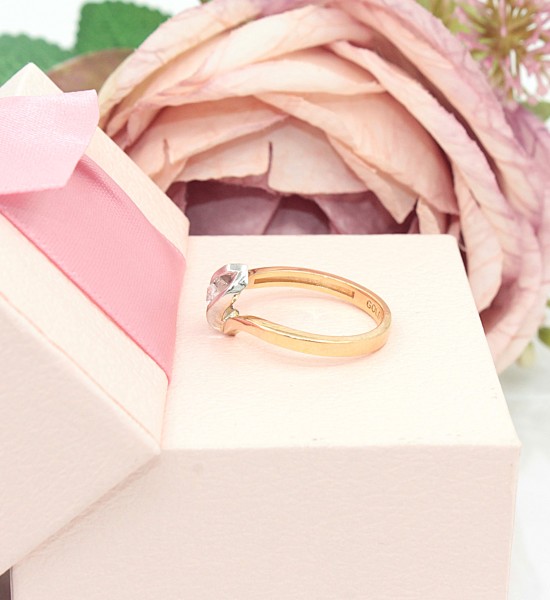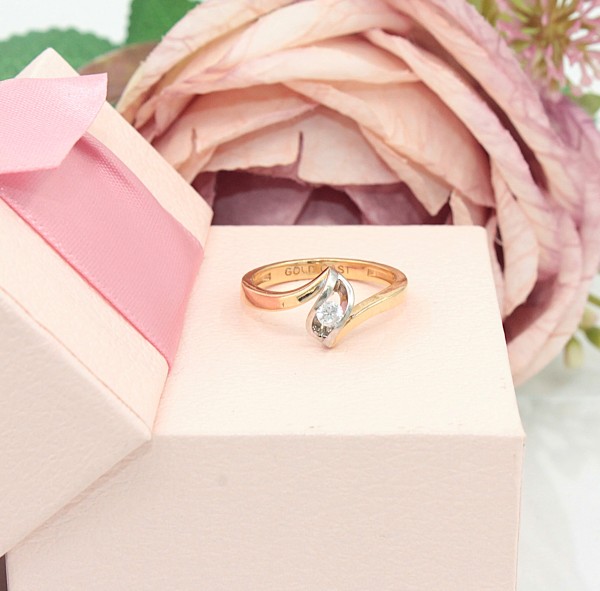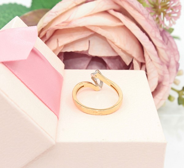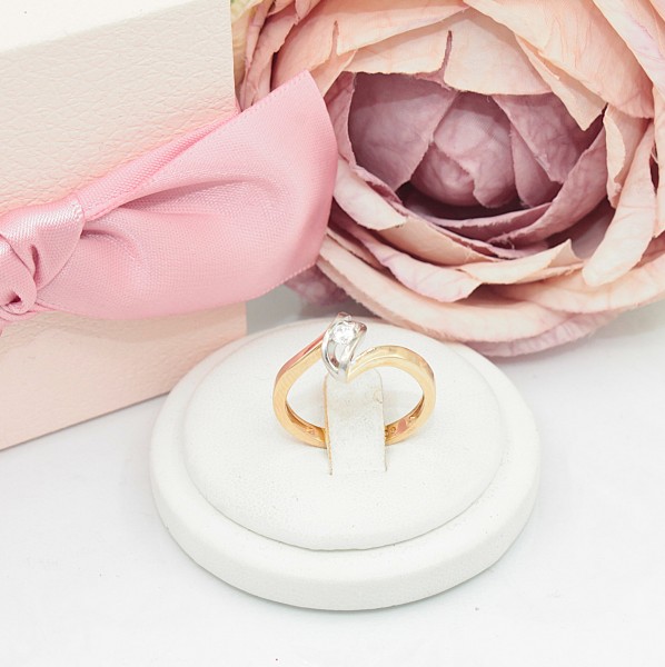 Przedmiotem sprzedaży jest pierścionek wykonany z 14-karatowego(p.585), żółtego i białego złota, ozdobiony na froncie cyrkonią.