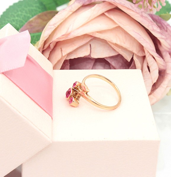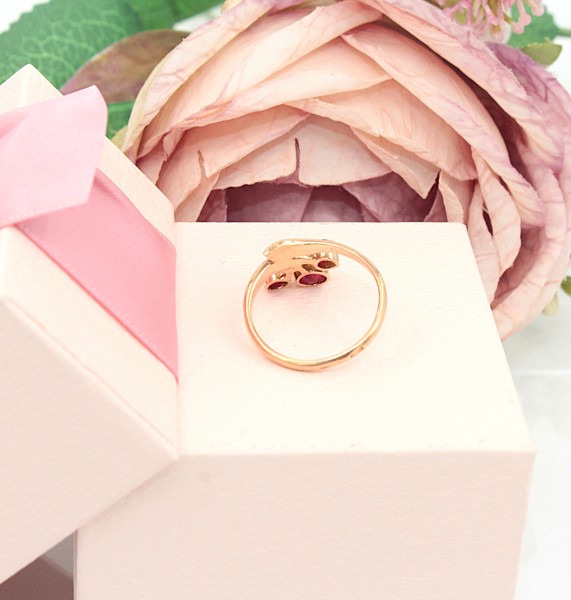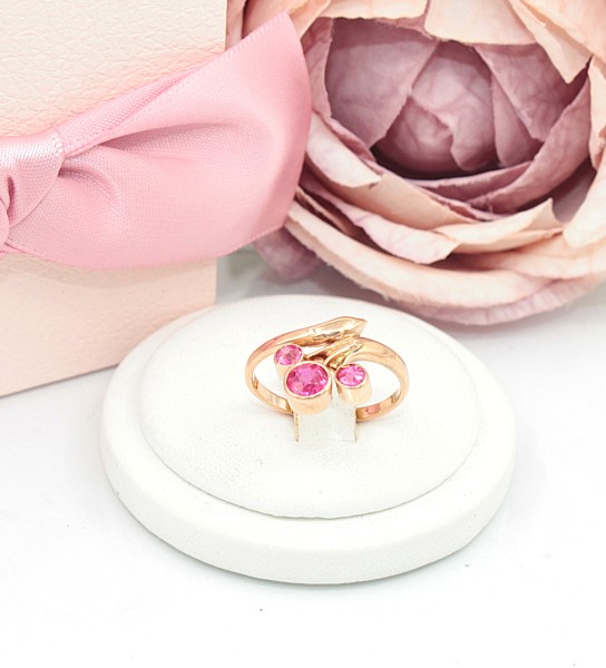 Przedmiotem sprzedaży jest pierścionek wykonany z 14-karatowego(p.585), różowego złota, ozdobiony różowymi kamieniami.