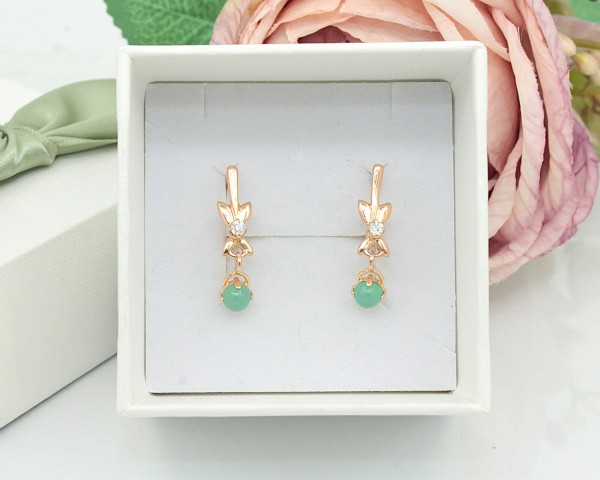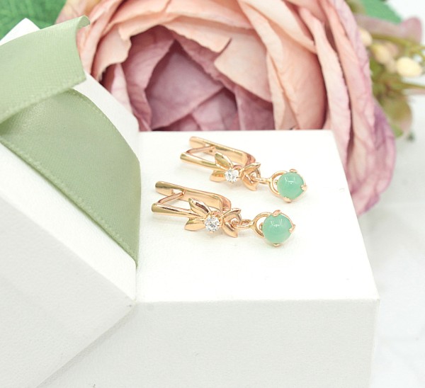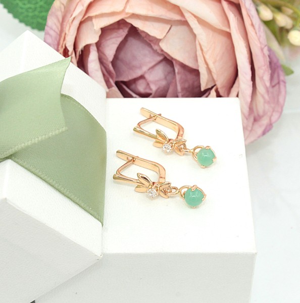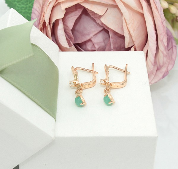Przedmiotem sprzedaży są kolczyki wykonane z 14-karatowego(p.585), różowego złota,ozdobione zielonym kamieniem i cyrkonią.