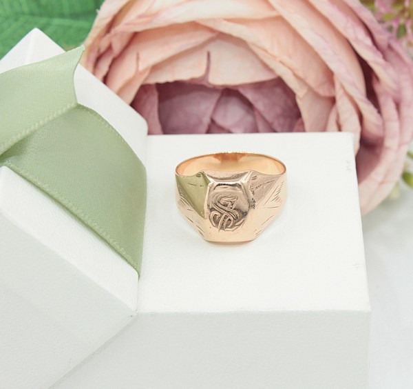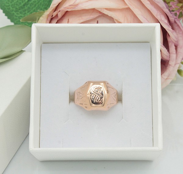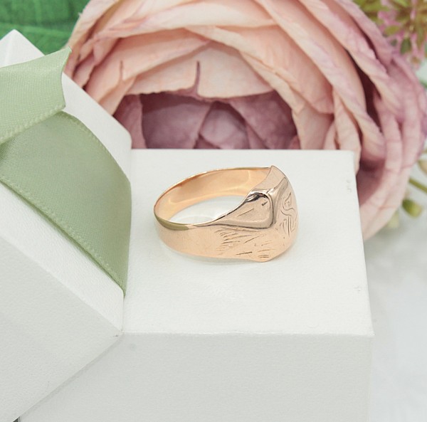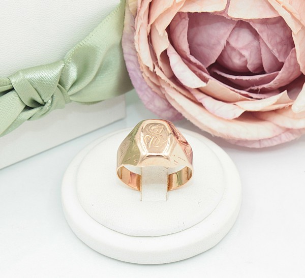 Przedmiotem sprzedaży jest sygnet wykonany z 14-karatowego(p.585),różowego złota, ozdobiony na froncie grawerem.