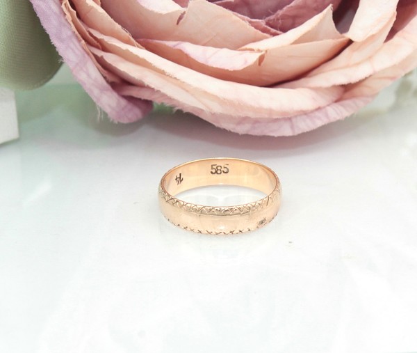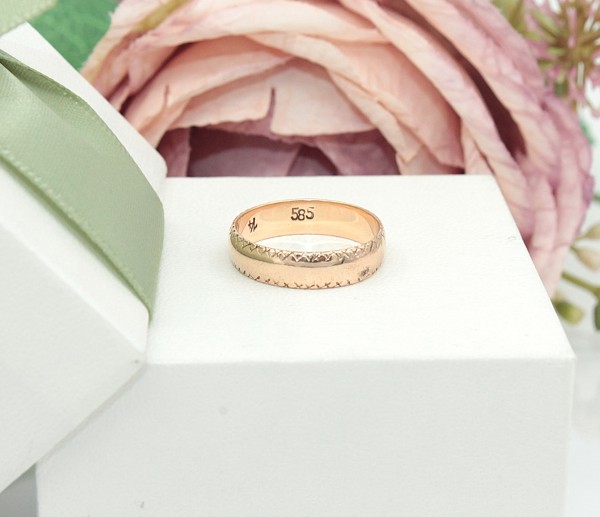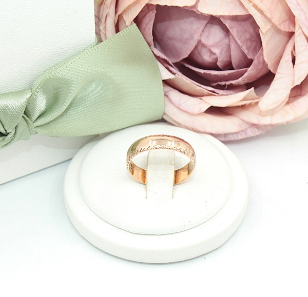 Przedmiotem sprzedaży jest obrączka, wykonana z 14-karatowego (p.585), różowego złota.