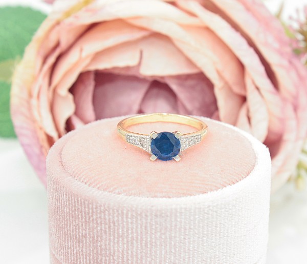 Przedmiotem sprzedaży jest pierścionek wykonany z 14-karatowego(p.585), żółtego złota, ozdobiony granatowym kamieniem i cyrkoniami.