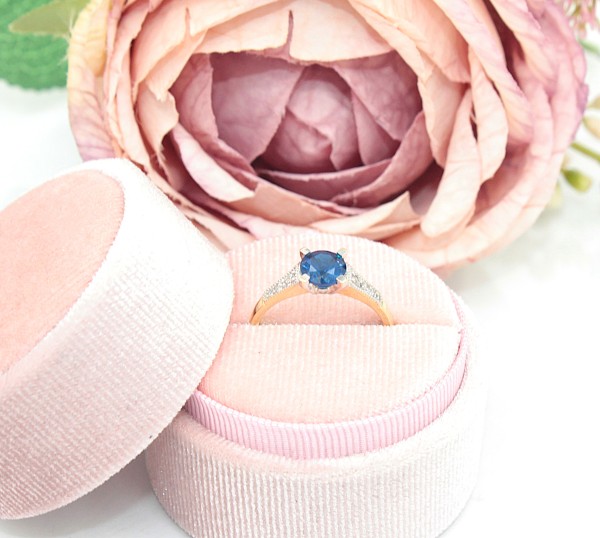 Złoty pierścionek p.585/2,61g z granatowym kamieniem i cyrkoniami ŁS