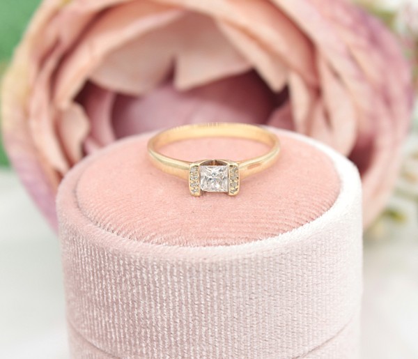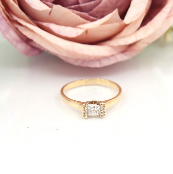 Przedmiotem sprzedaży jest pierścionek wykonany z 14-karatowego(p.585), żółtego złota, ozdobiony na froncie cyrkoniami.