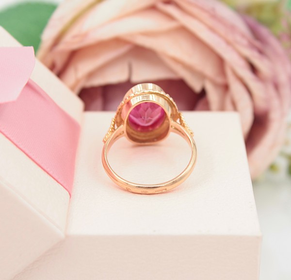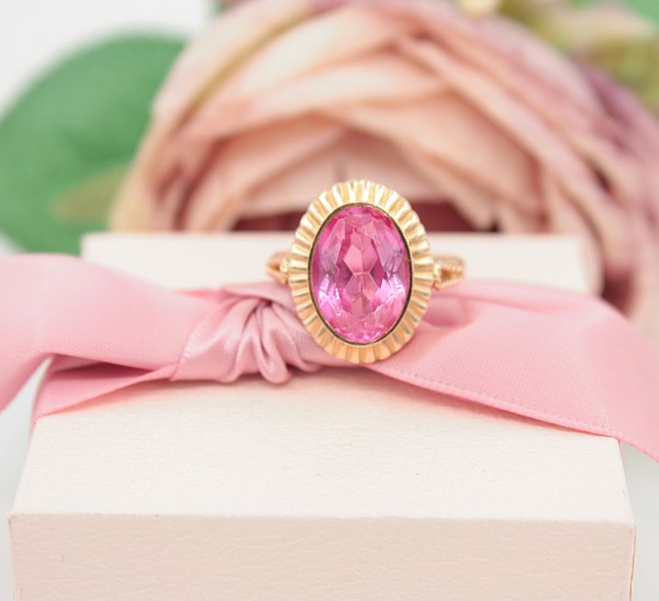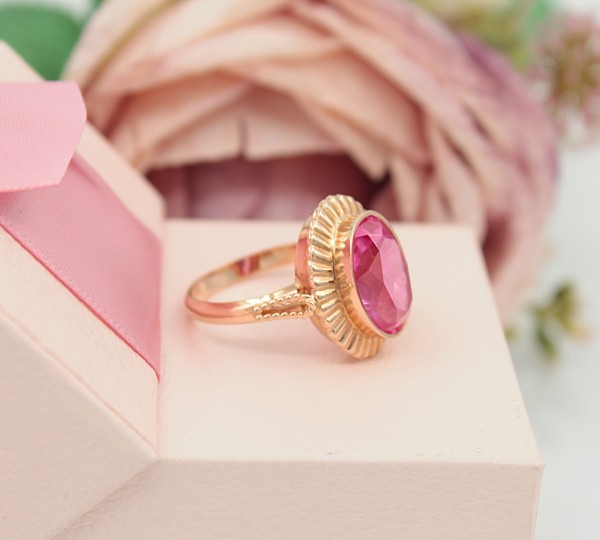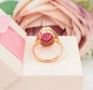 Przedmiotem sprzedaży jest pierścionek wykonany z 14-karatowego(p.585), różowego złota z różowym kamieniem.
