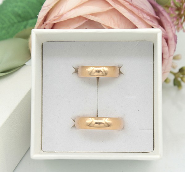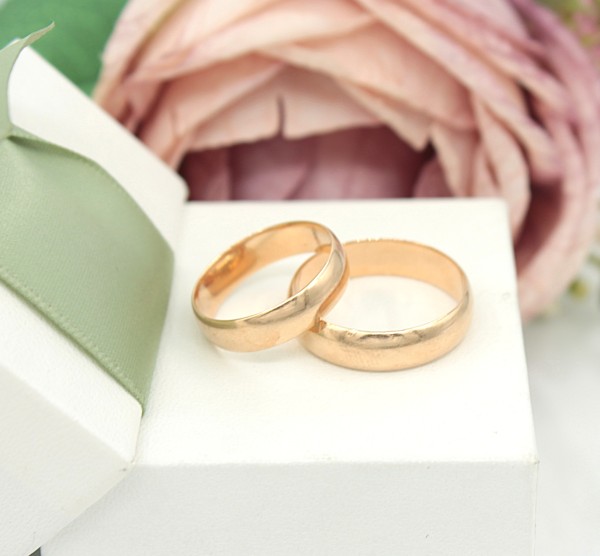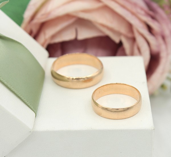 Przedmiotem sprzedaży jest komplet obrączek ślubnych - klasyczny model, wykonany z 14-karatowego (p.583), żółtego złota