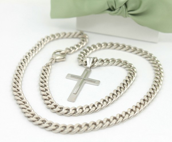 Przedmiotem sprzedaży jest srebrny łańcuch - splot Pancerka z zawieszką Krzyżem, wykonany ze srebra w pr.925.
