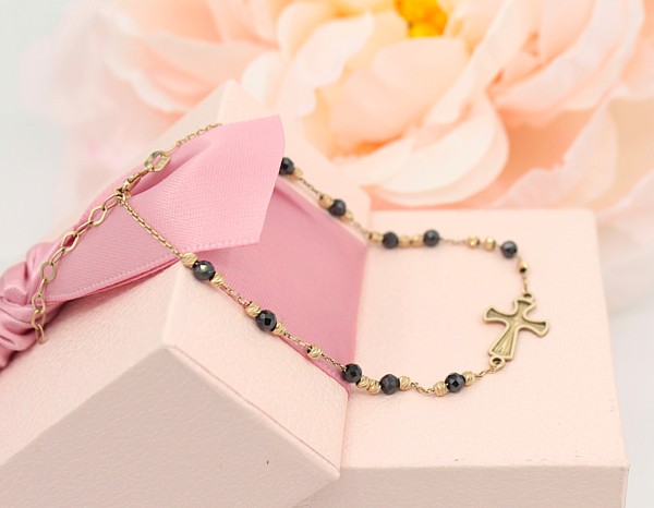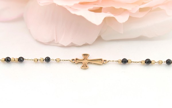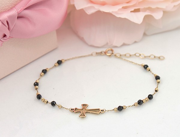 Przedmiotem sprzedaży jest bransoletka,wykonana z 14-karatowego (p.585)żółtego złota z Krzyżykiem i czarnymi kamieniami.