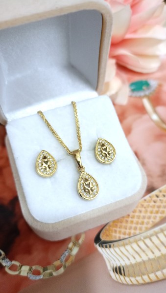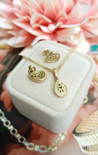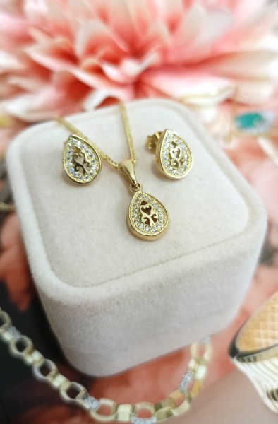 Przedmiotem sprzedaży jest komplet biżuterii kolczyki z zawieszką wykonany z 14-karatowego (p.585), żółtego złota.