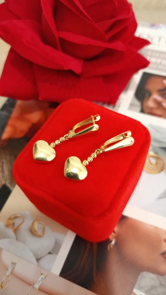 Przedmiotem sprzedaży są złote, wiszące kolczyki z sercem, wykonane z 14-karatowego (p.585), żółtego złota.