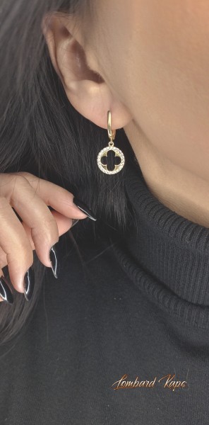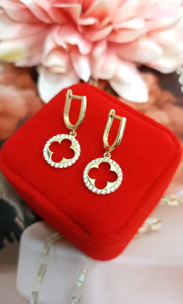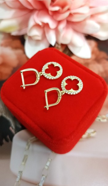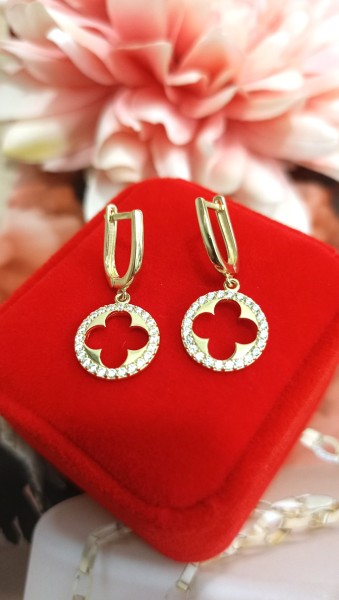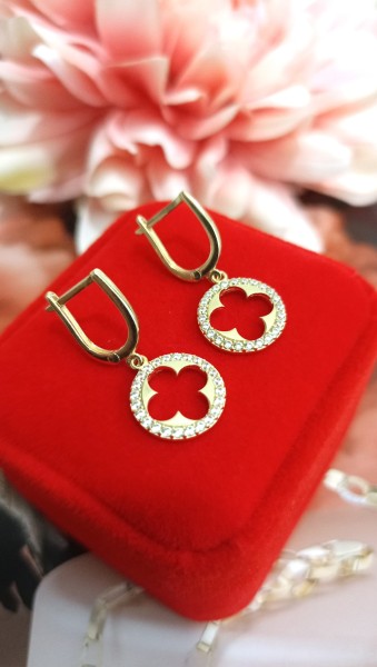 Przedmiotem sprzedaży są złote, wiszące kolczyki ''marokańska koniczyna'' wysadzane białymi cyrkoniami, wykonane z 14-karatowego (p.585), żółtego złota.