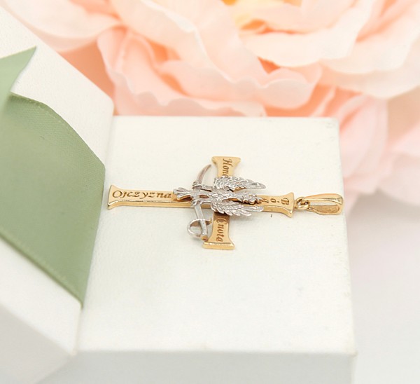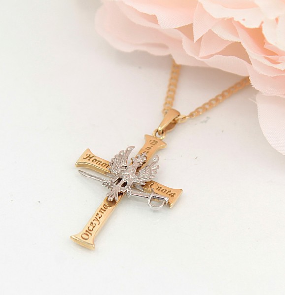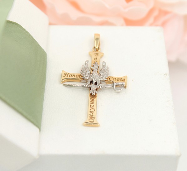 Przedmiotem sprzedaży jest zawieszka - Krzyż Patriotyczny Bóg, Honor, Cnota, Ojczyzna, wykonana z 14-karatowego (p.585),żółtego i białego złota.