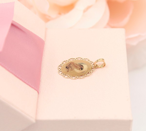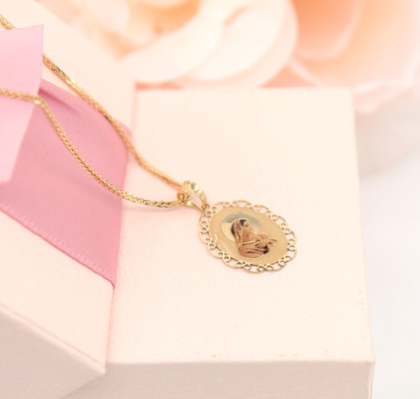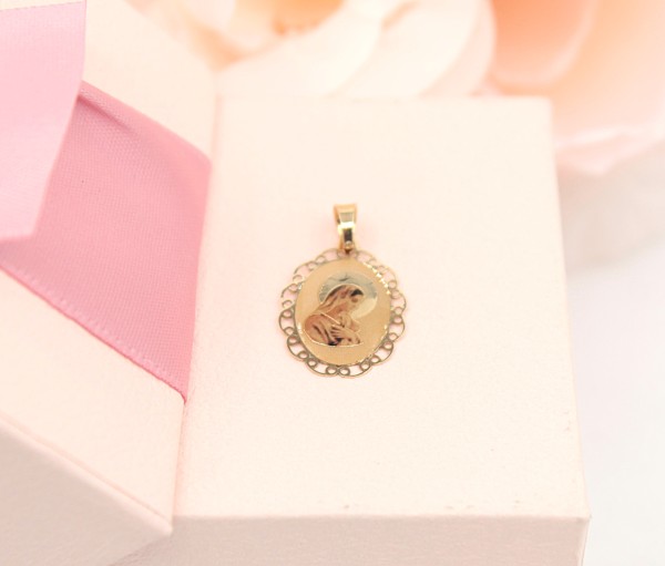 Przedmiotem sprzedaży jest zawieszka z wizerunkiem Matki Boskiej, wykonana z 14-karatowego (p.585),żółtego złota.